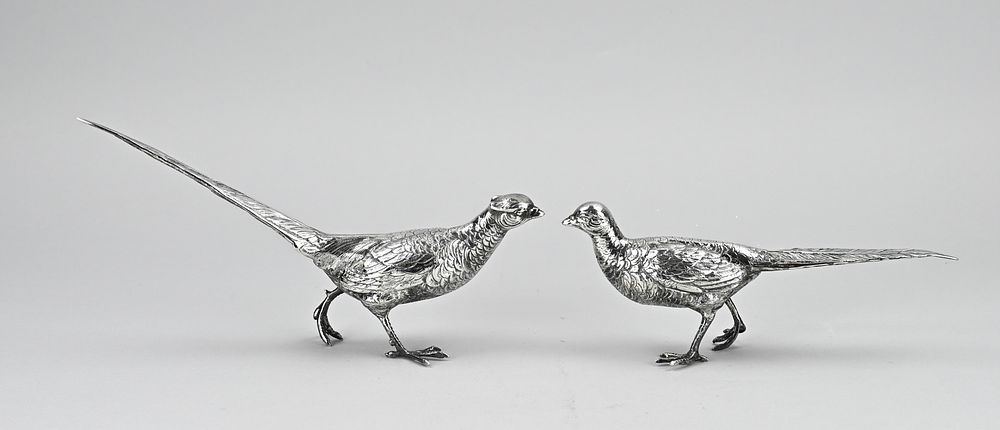 Pair of silver pheasants, 835/000, male and female. MT.: EADAubert, (Lancelle jewelers) The Hague. 23-27 cm. Total ...